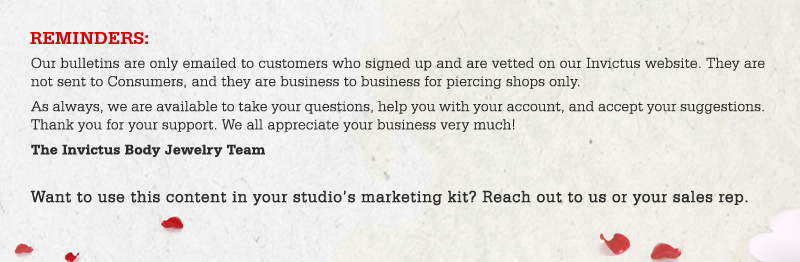 Hey there, Welcome to the latest Invictus New Style Bulletin, where we’re going to show you some new stuff (of course!) but also, some essentials for every piercing that we specialize in. GOLD LABRET BASES • 14kt, nickel-free solid gold threadless labret with 3mm base. • All threadless tops are interchangeable with all bases! […]