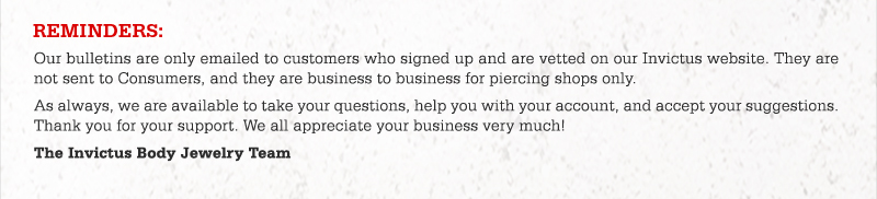 Hey there, Welcome to the latest Invictus New Style Bulletin, where we’re going to show you some stuff (of course!) but also, some essentials for every piercing that we specialize in. The TWISTED CLICKERS • Made from Implant Grade Titanium (TI-6AL-4V-ELI ASTM F136) • Available in 16g 3/8″ (10mm) or 16g 1/2″ (12.7mm) • Vitalize […]