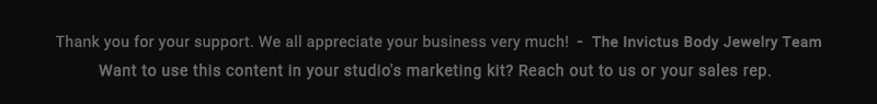 Hello and welcome to the latest Invictus New Style Bulletin – as always, we have new to stock beautiful, quality body jewelry to share with you. 24KT GOLD PVD TITANIUM… EVERYTHING! • Made from pure 24kt Gold PVD Implant Grade Titanium • Threadless, prong set (no glue used) colored cubic zirconia tops • 2mm, 2.5mm, […]